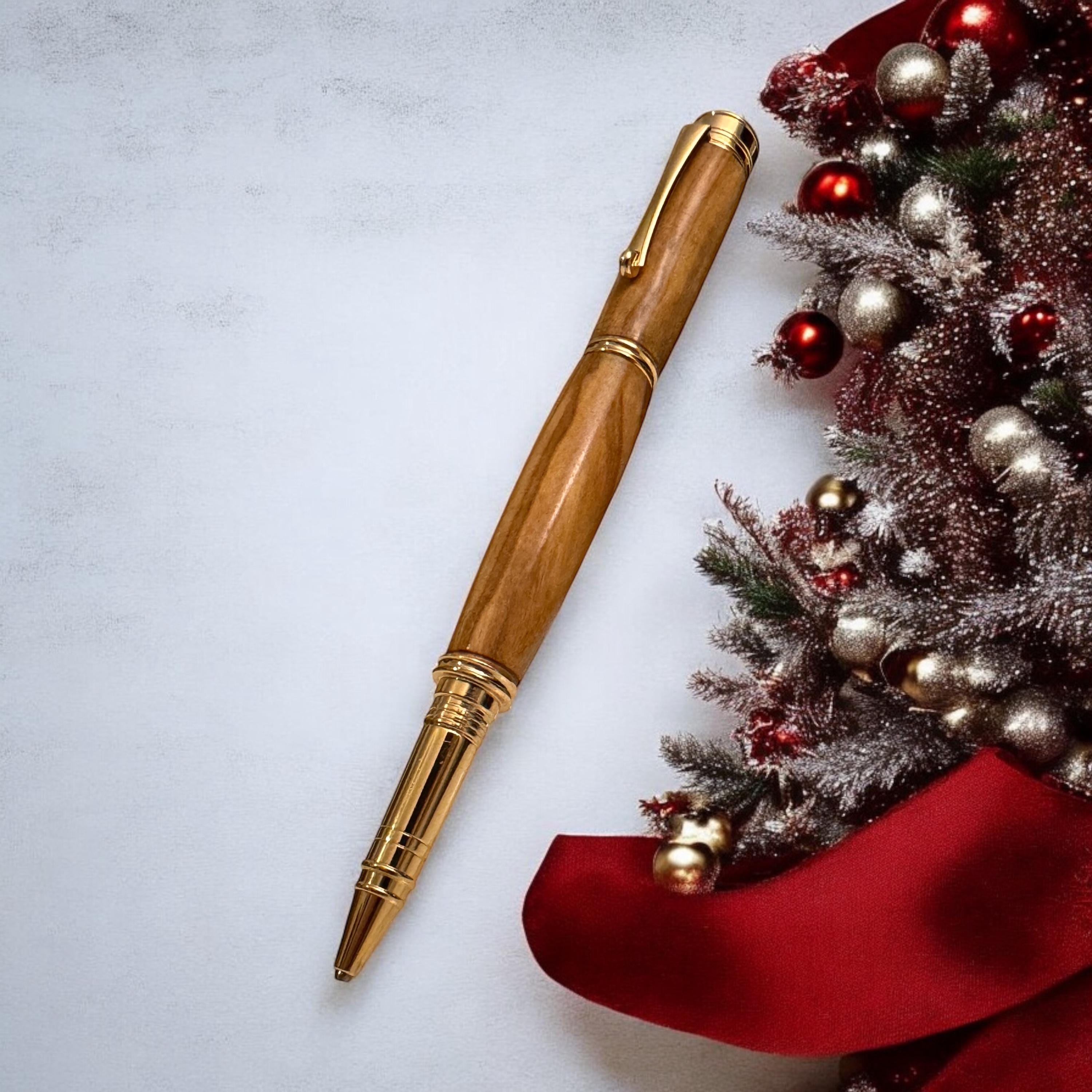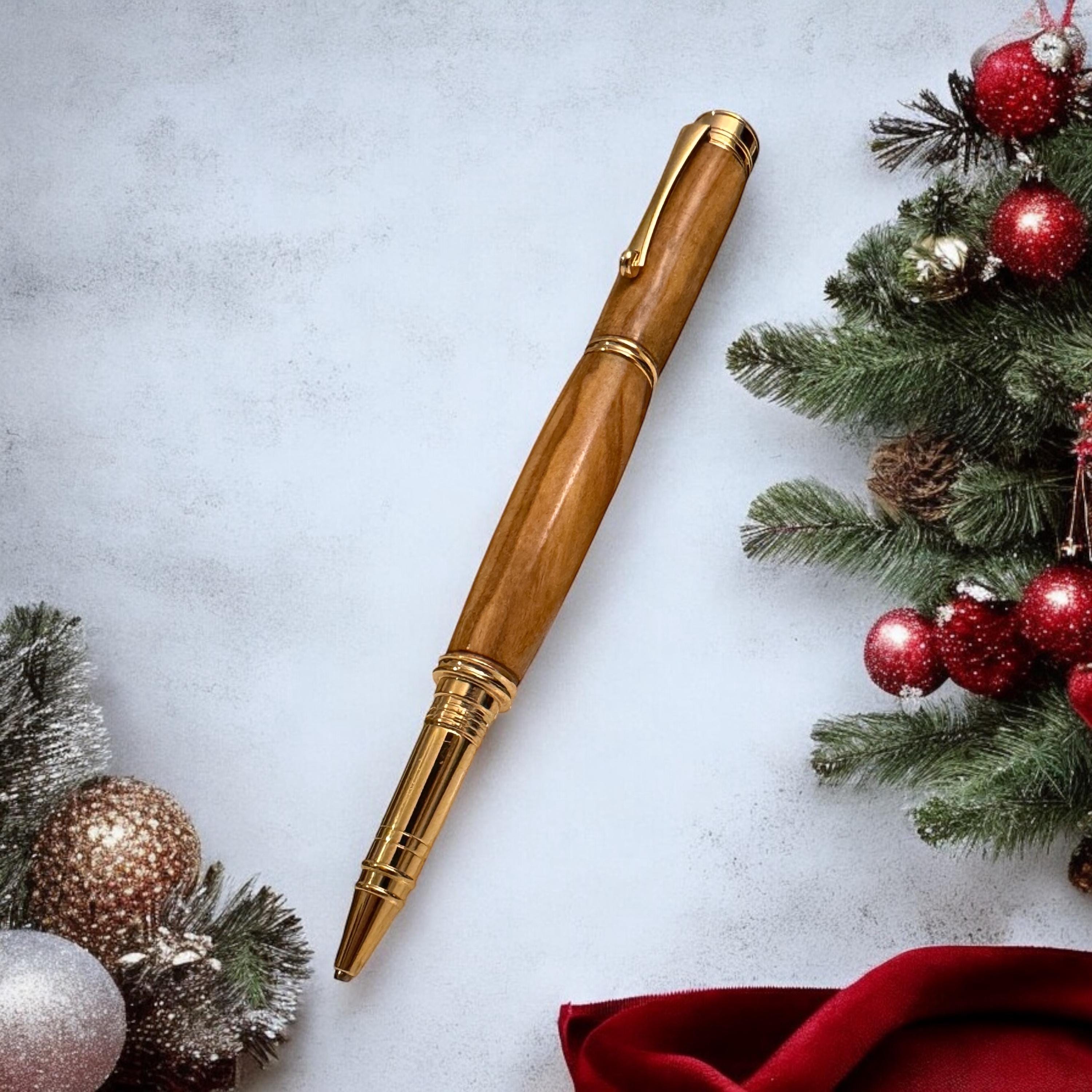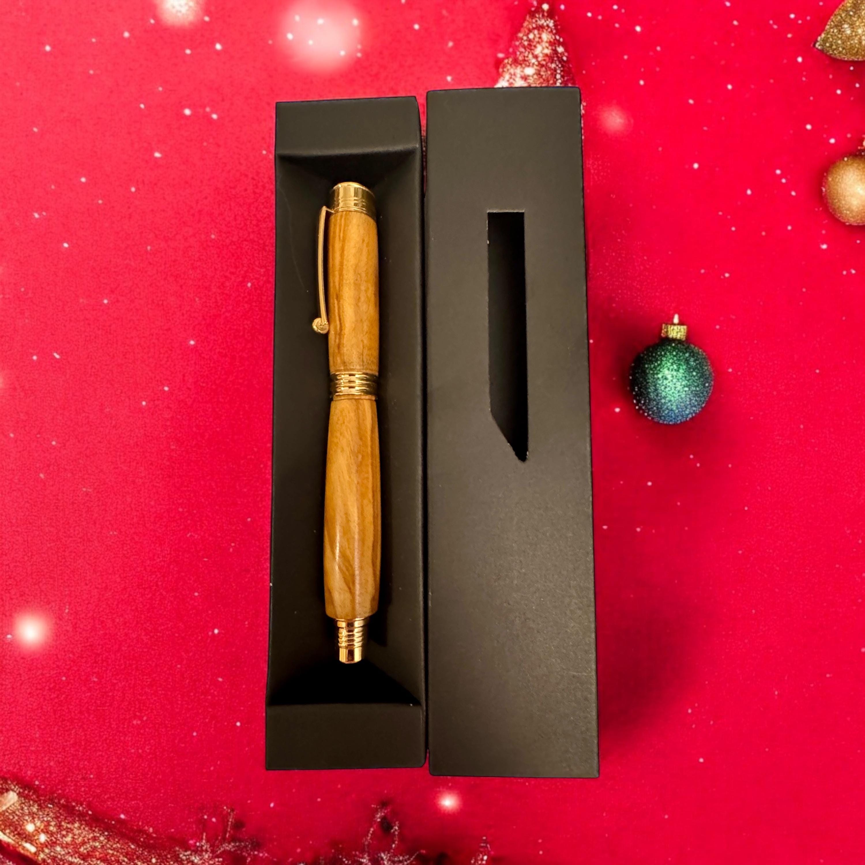 This pen is assembled using a kit of a very high standard. Not the cheaper kits available and matched with a quality and expressively grained Olive Hardwood. The pen is a posting pen, meaning the cap fits on the end when in use. Plated in 24ct Gold it just screams quality. The roller ball refill is a Schmidt ceramic type made in Germany. This is a must for anyone who wants to use a quality and exclusive pen. If you are looking for a Christmas gift for your Parent, Grandparent, Parent, Brother or Sister, your favourite teacher or professional person this is the gift you need. Great as a stocking filler or secret santa its sure to bring some Christmas cheer to that special person.
