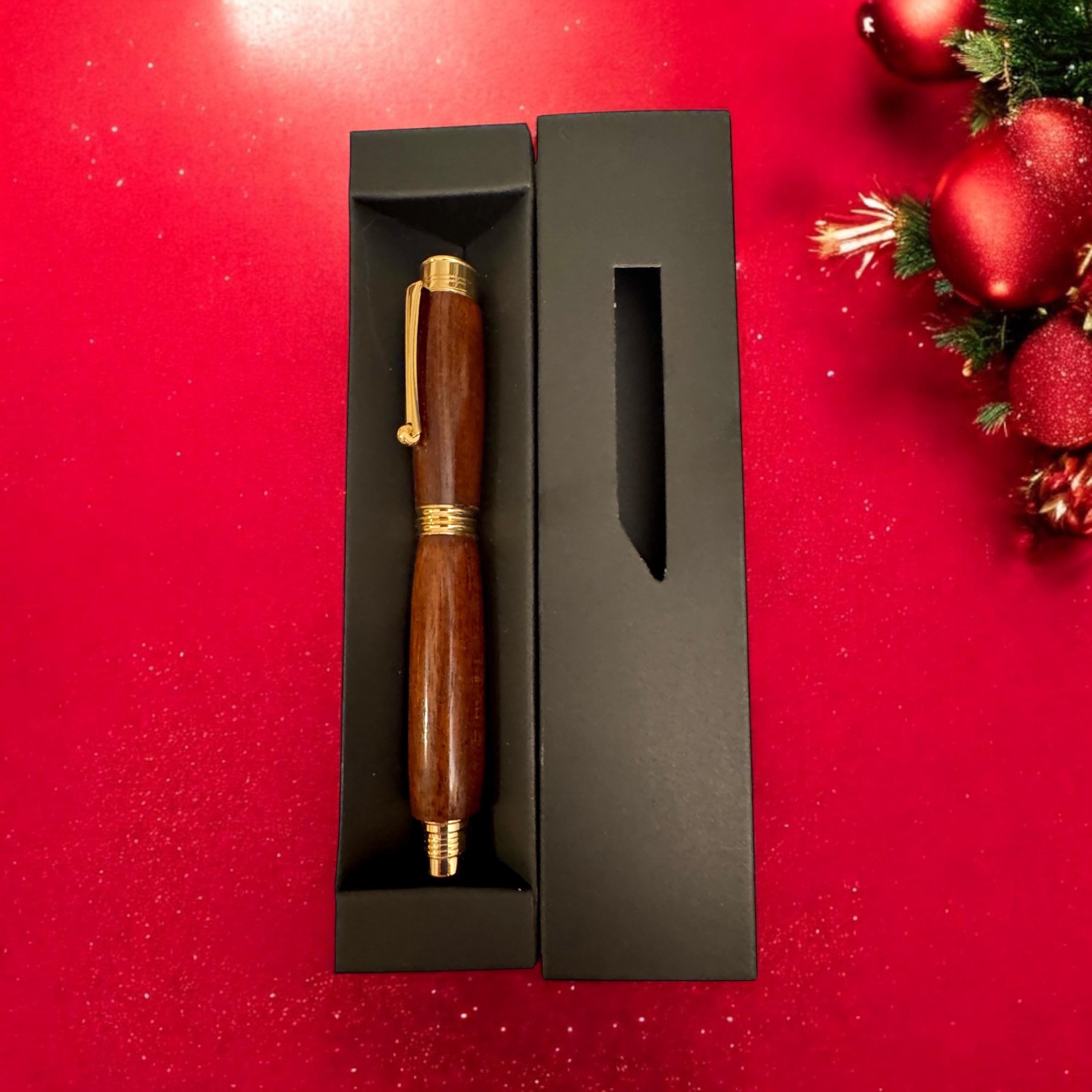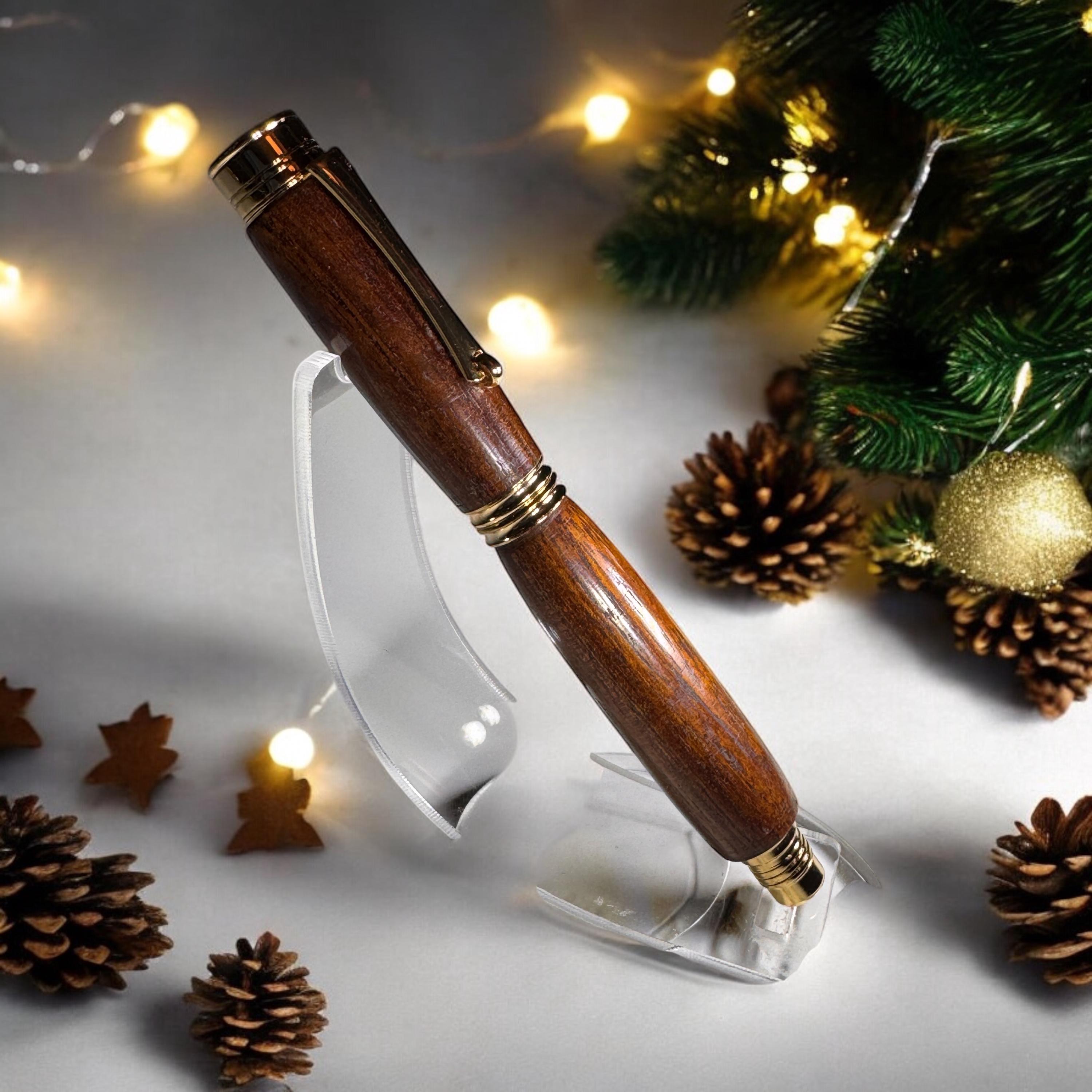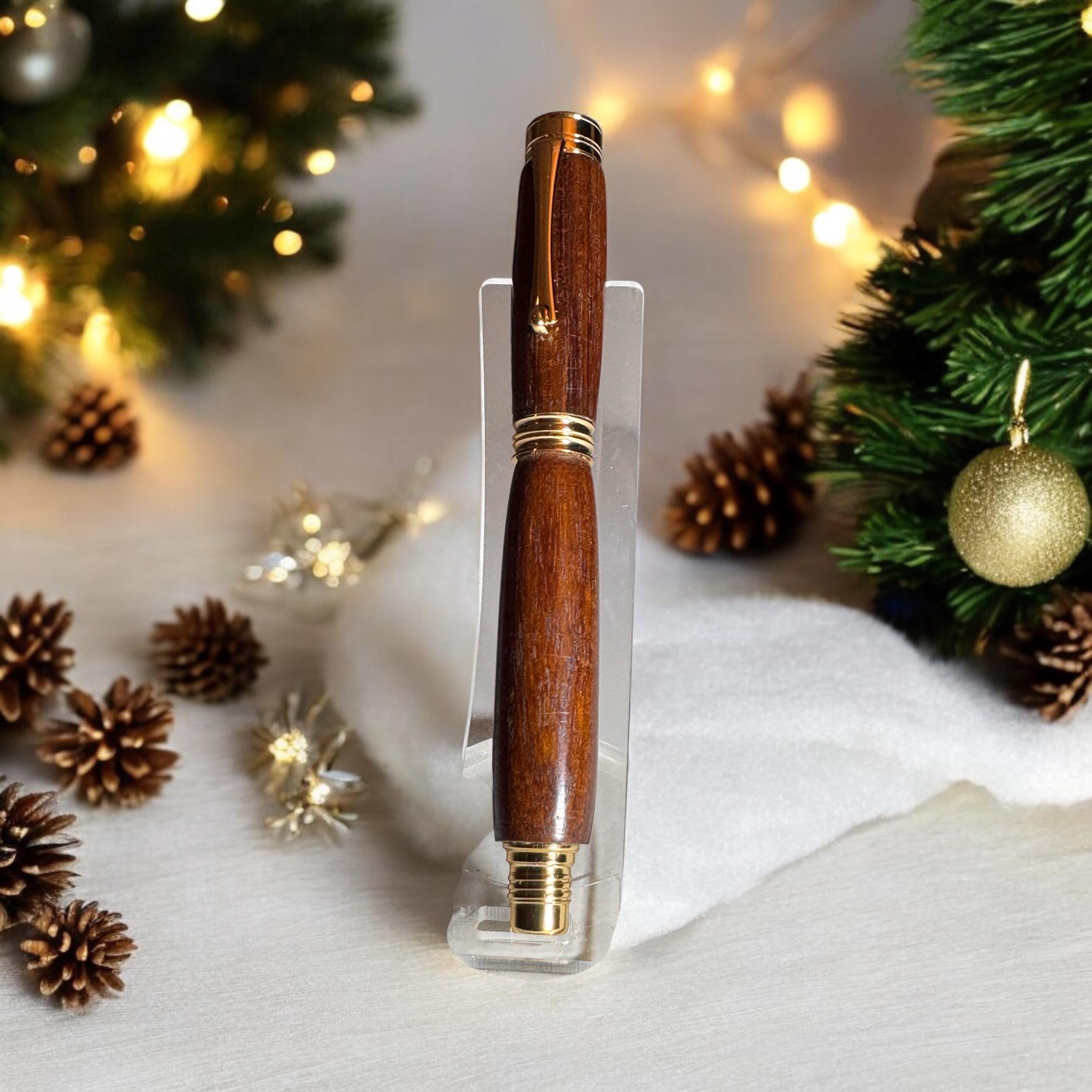 This pen is assembled using a kit of a remarkably high standard. Not the cheaper kits available and matched with quality Knob Thorne Hardwood. The pen is a posting pen, meaning the cap fits on the end when in use. Plated in 24ct Gold it just screams quality. The roller ball refill is a Schmidt ceramic type made in Germany. This is necessary for anyone who wants to use a quality and exclusive pen. If you are looking for a Christmas gift for your Parent, Grandparent, Parent, Brother or Sister, your favourite teacher or professional person this is the gift you need. Great as a stocking filler or secret santa its sure to bring some Christmas cheer to that special person.